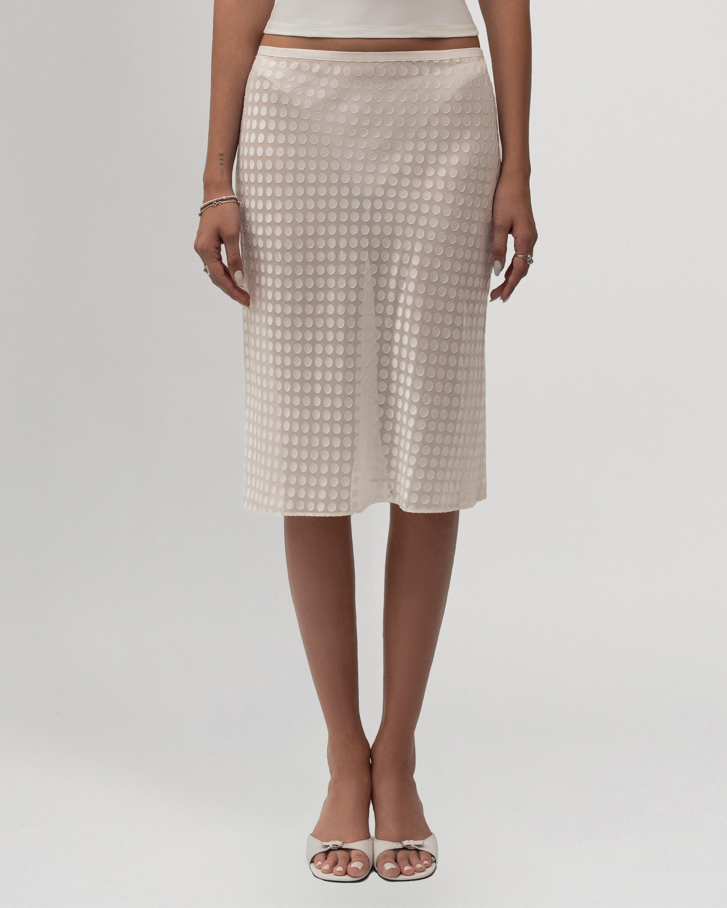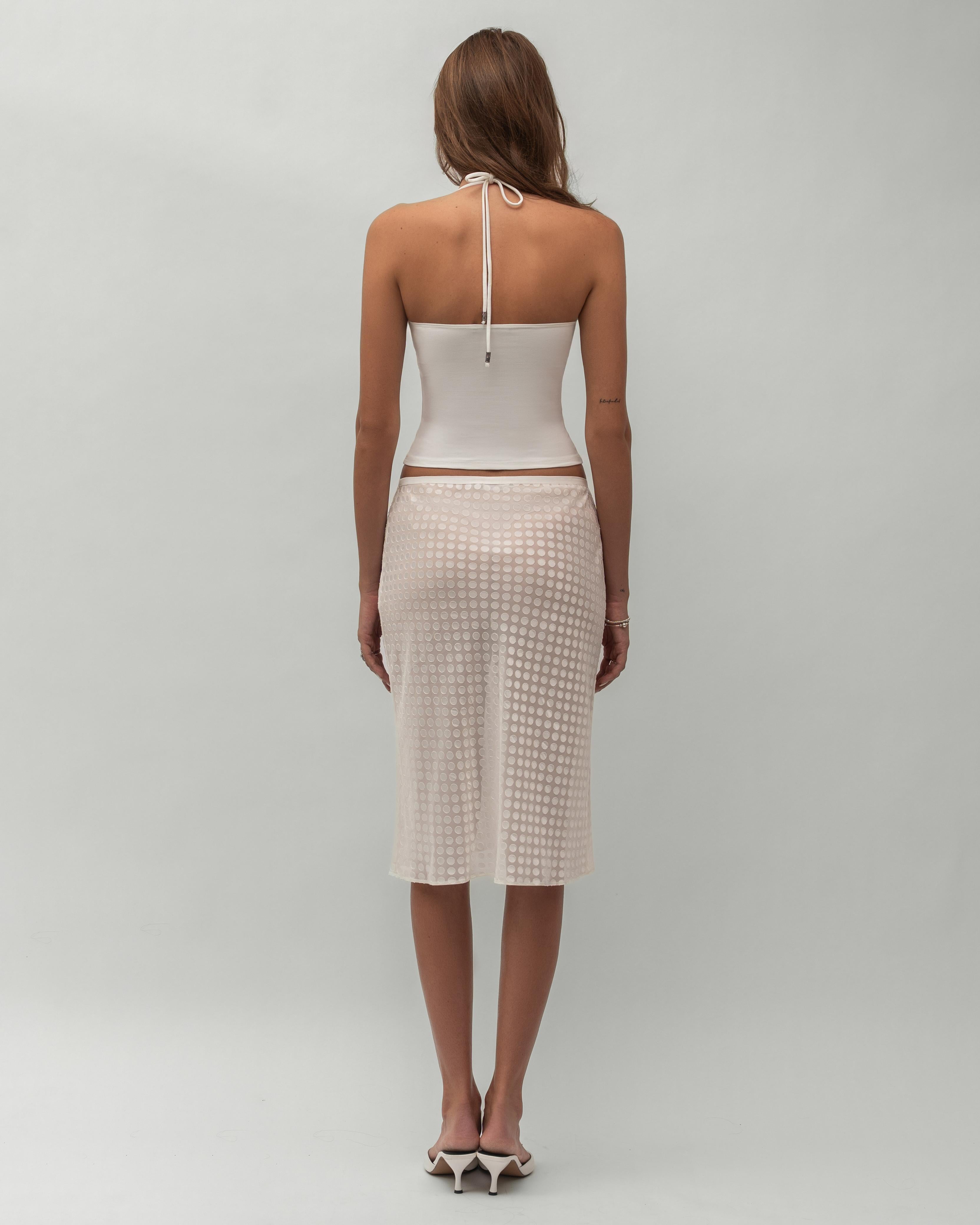The Ariel Skirt is our take on polka dots through a 90s futuristic lense. Made from a unique semi-transparent chiffon with reflective satin dots, it’s light, fluid and made to move with you.