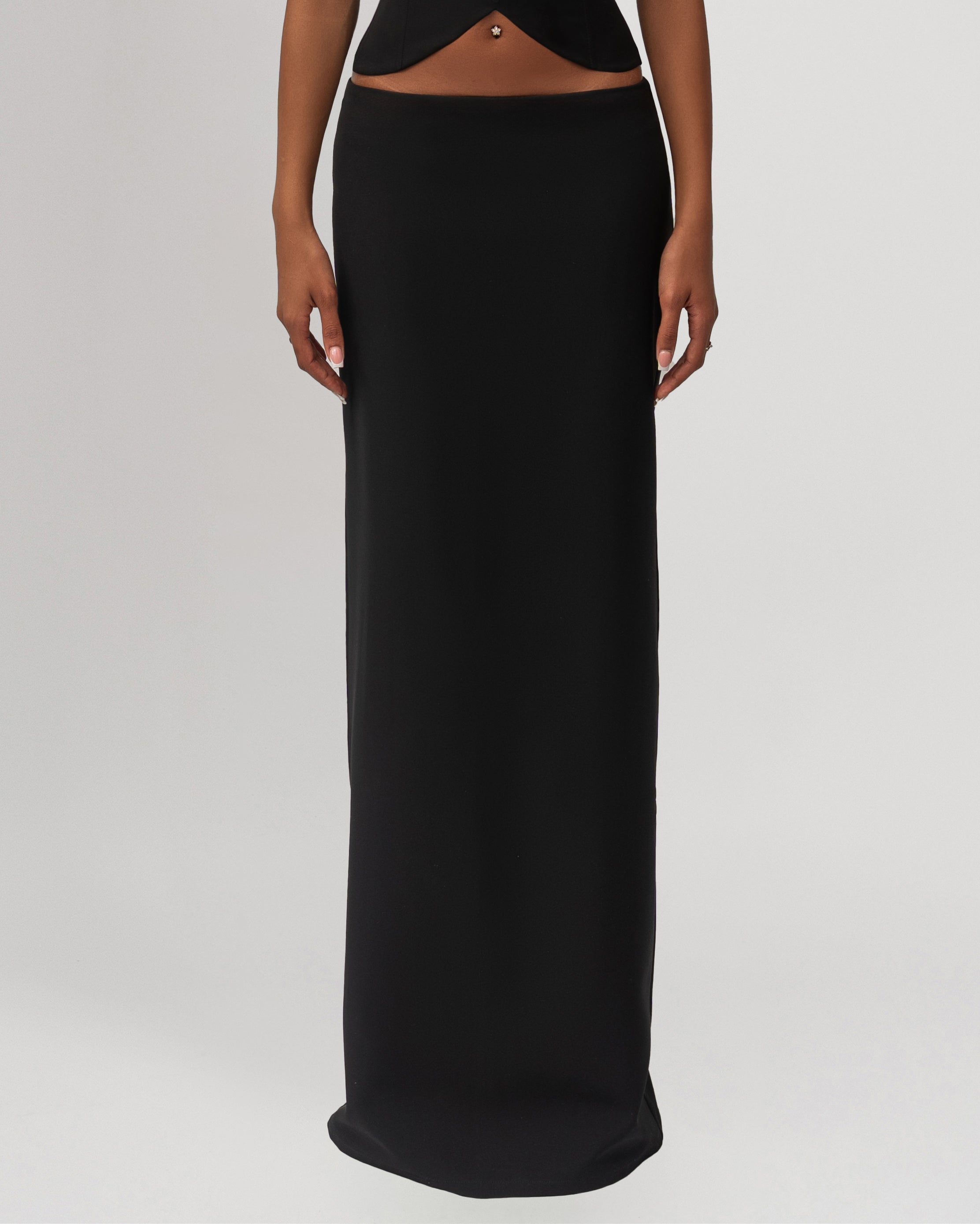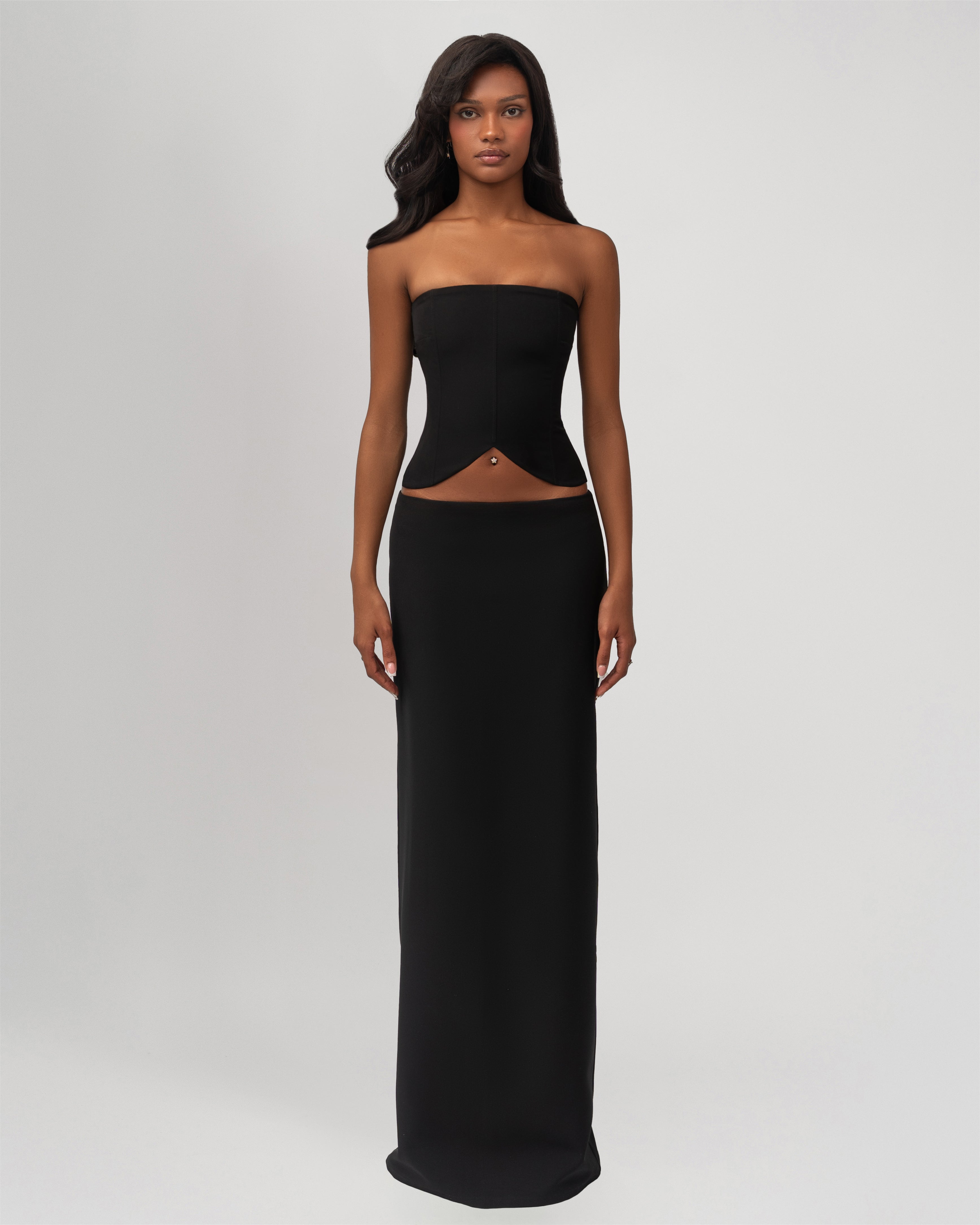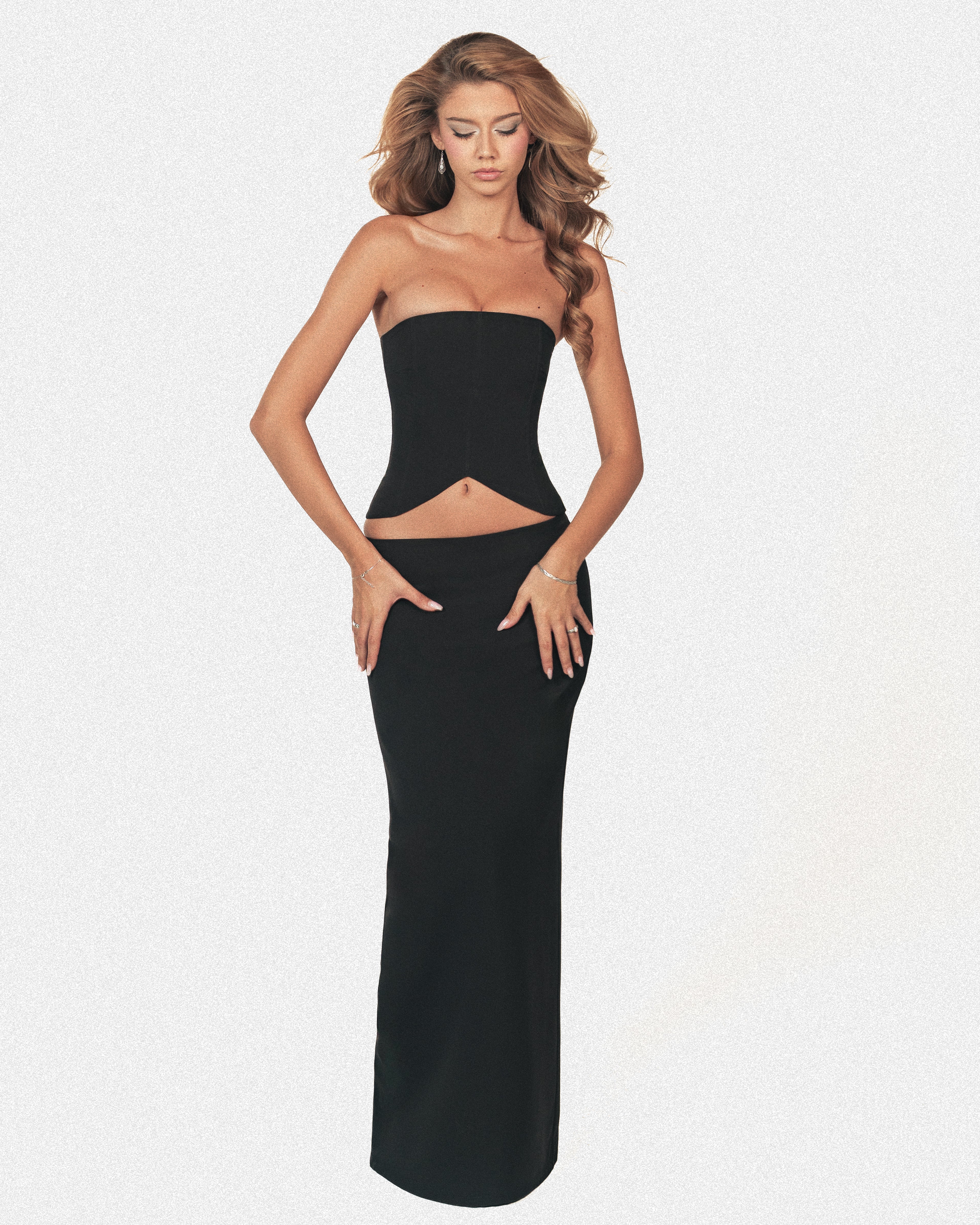 The Adele Set is minimalism with an edge. The black corset features structured boning and a sharp triangular cut at the bottom that reveals the waist and snatches the figure. Paired with a skirt, finished with a back slit for movement, both pieces close with sleek zippers.
