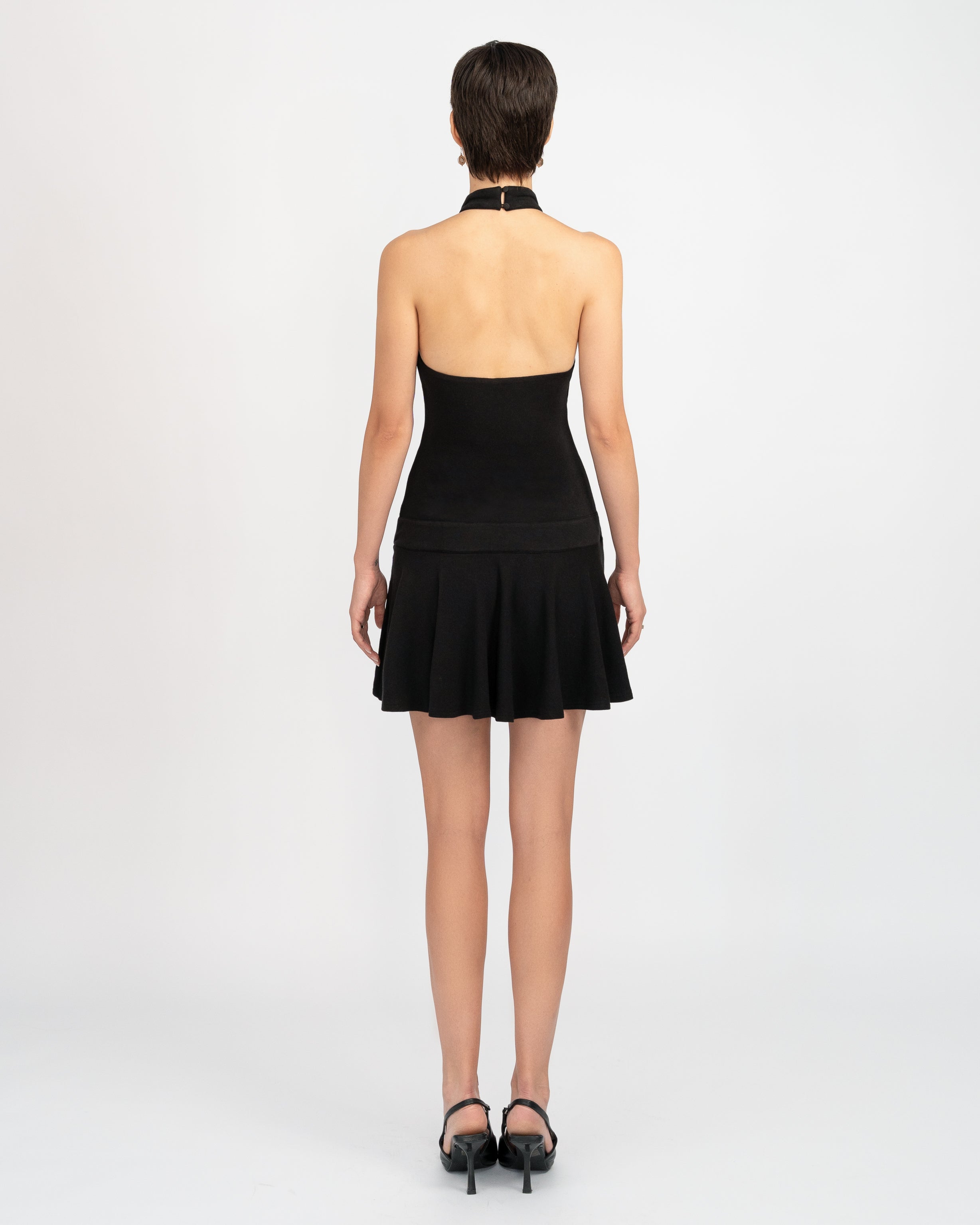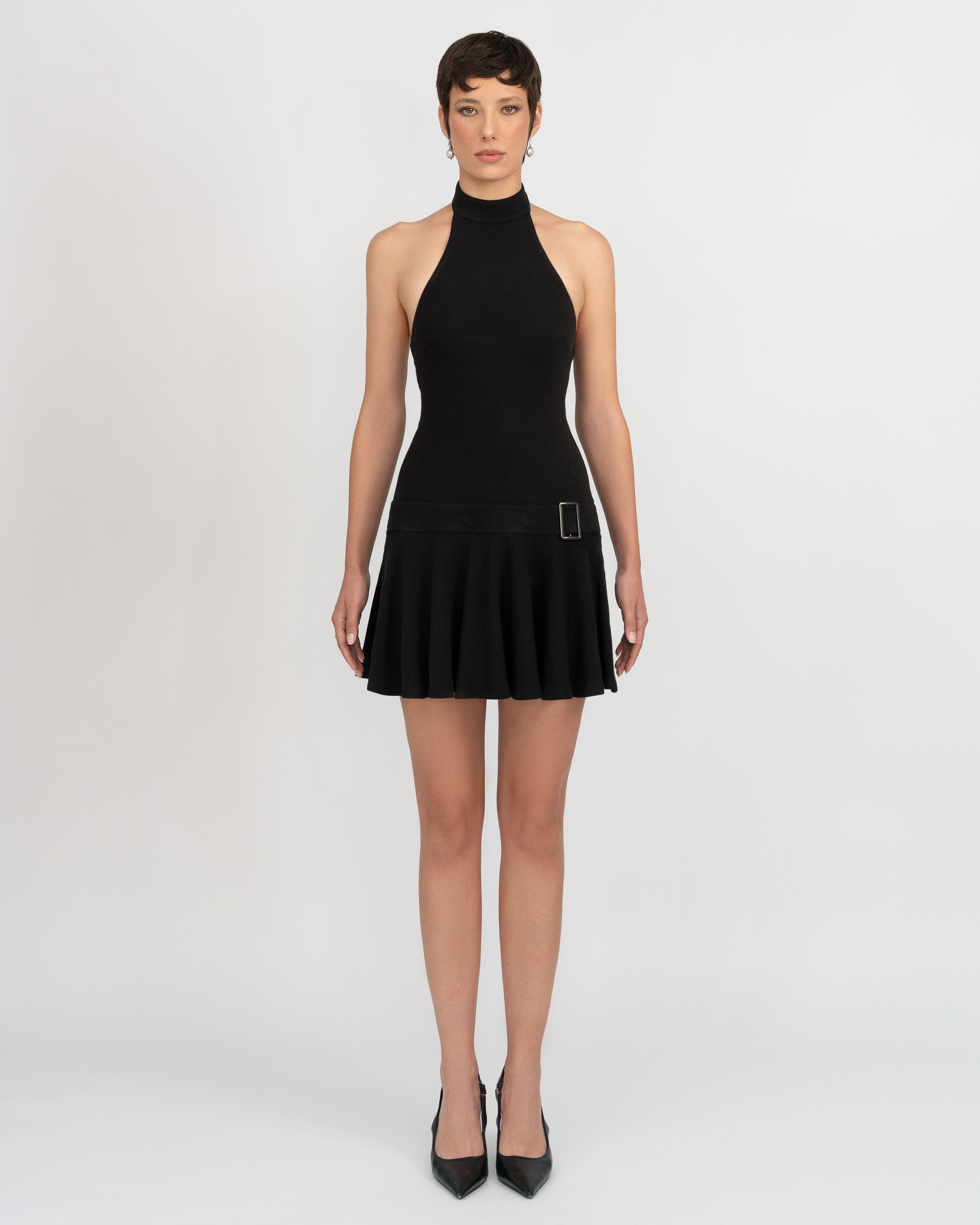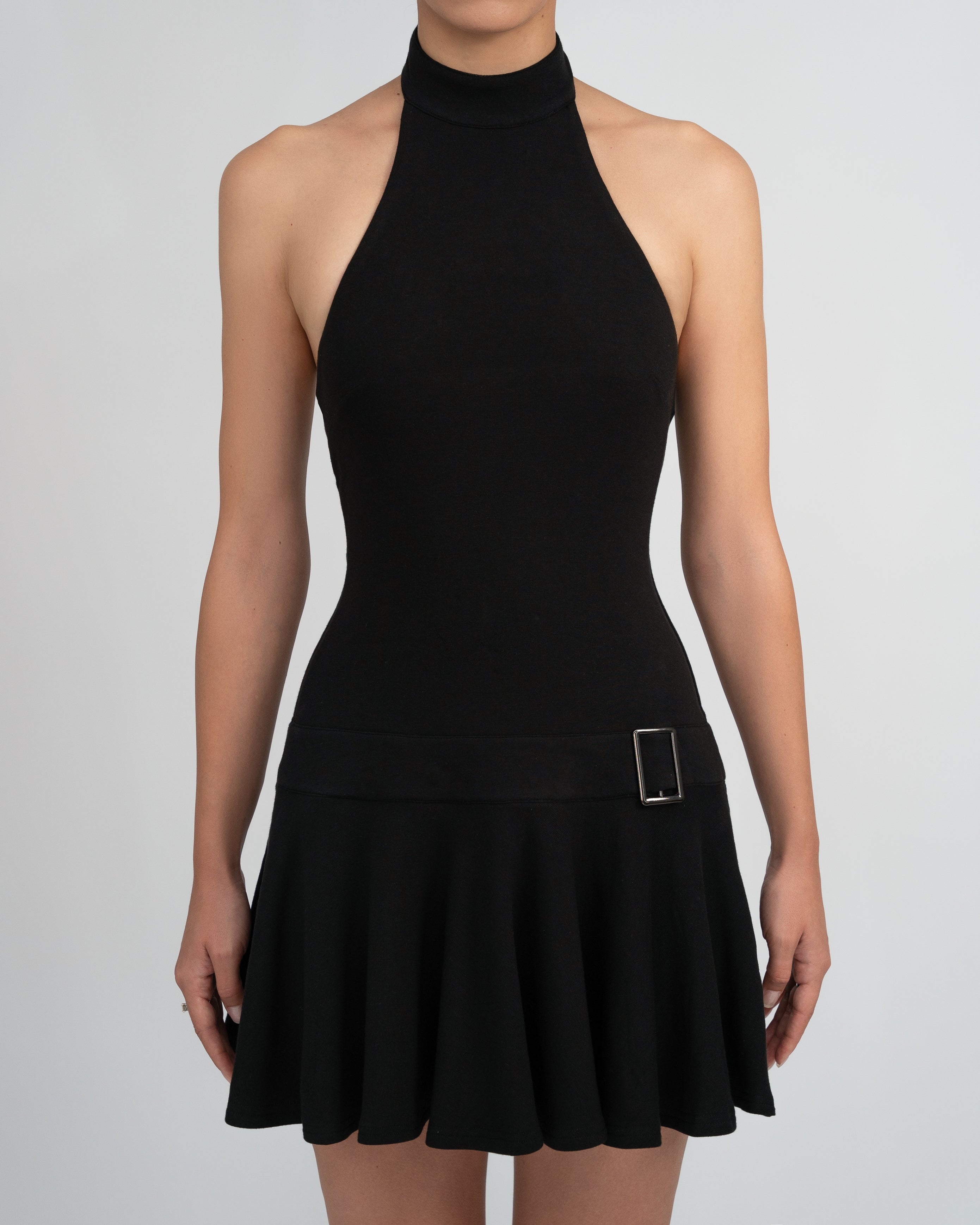 The Ivy Dress is a sleek and versatile wardrobe staple. With a high halter neckline and open back, it provides a flattering and comfortable fit. The A-line skirt adds subtle movement, while the metal buckle detail at the waist elevates the look and makes it more playful.
