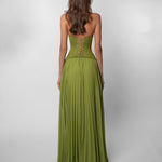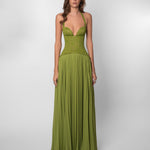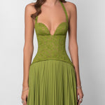 The Gaia Dress comes in a rich green tone, featuring our signature floral lace on the top part with boning and a snatching corset. The pleated skirt drapes effortlessly, moving with a soft, graceful flow. Guaranteed to be the most unique dress in the room, made to steal the spotlight.