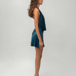 The Jade Dress is made for the night life. In deep navy, cut with a plunging cowl neckline, a full open back with a tie-up neck, and a line of sequins across the skirt that catches the light.