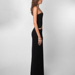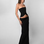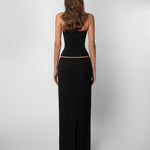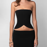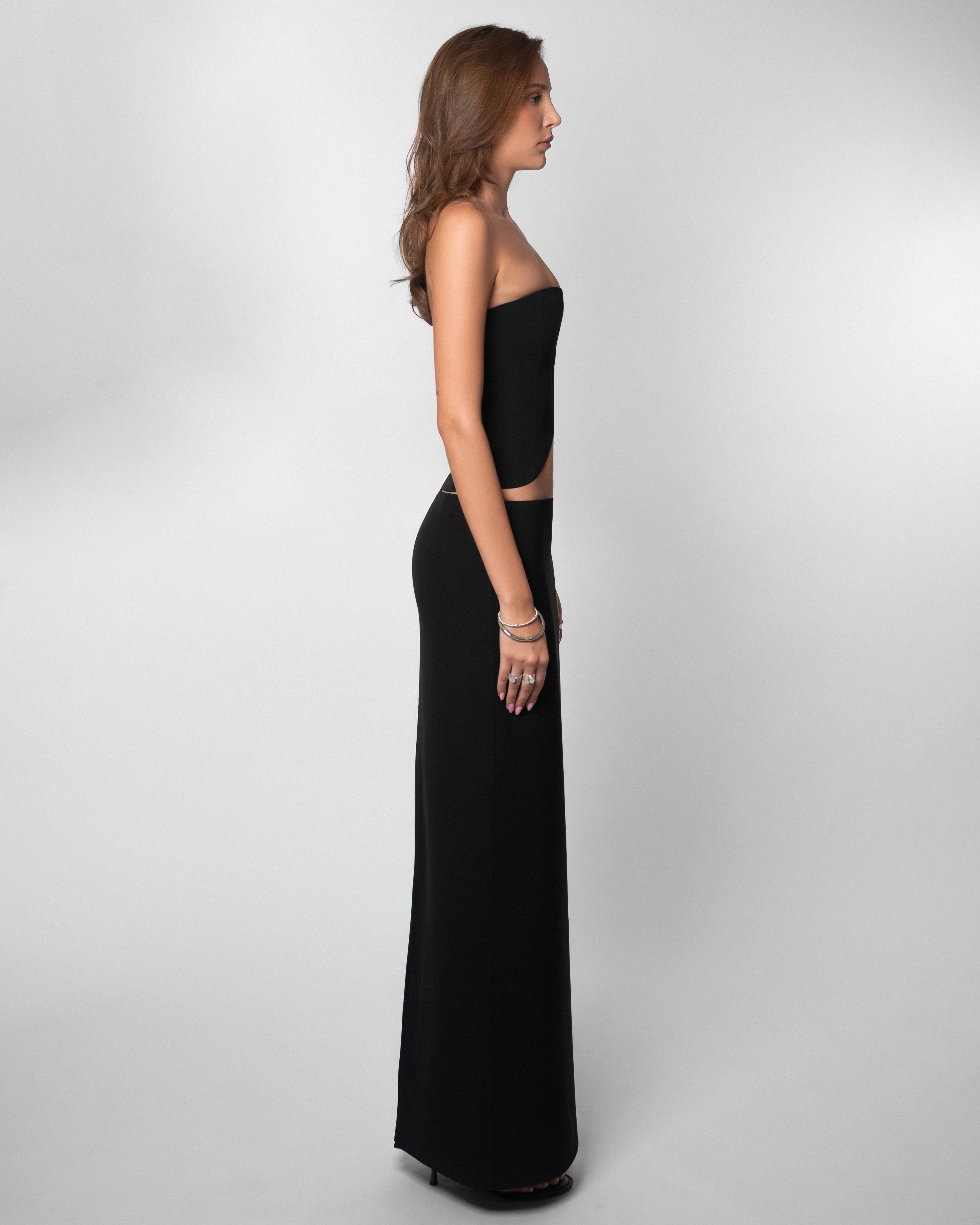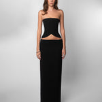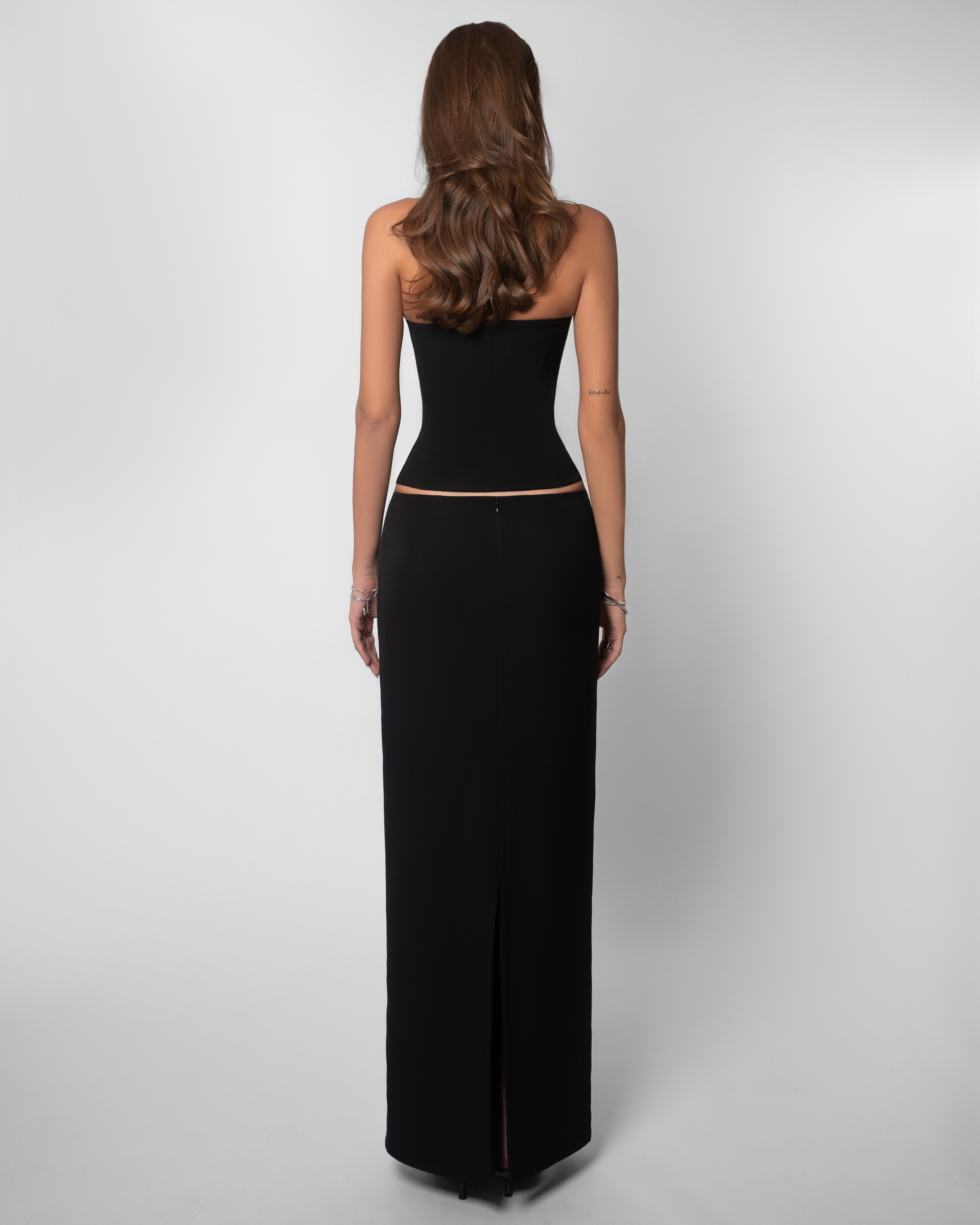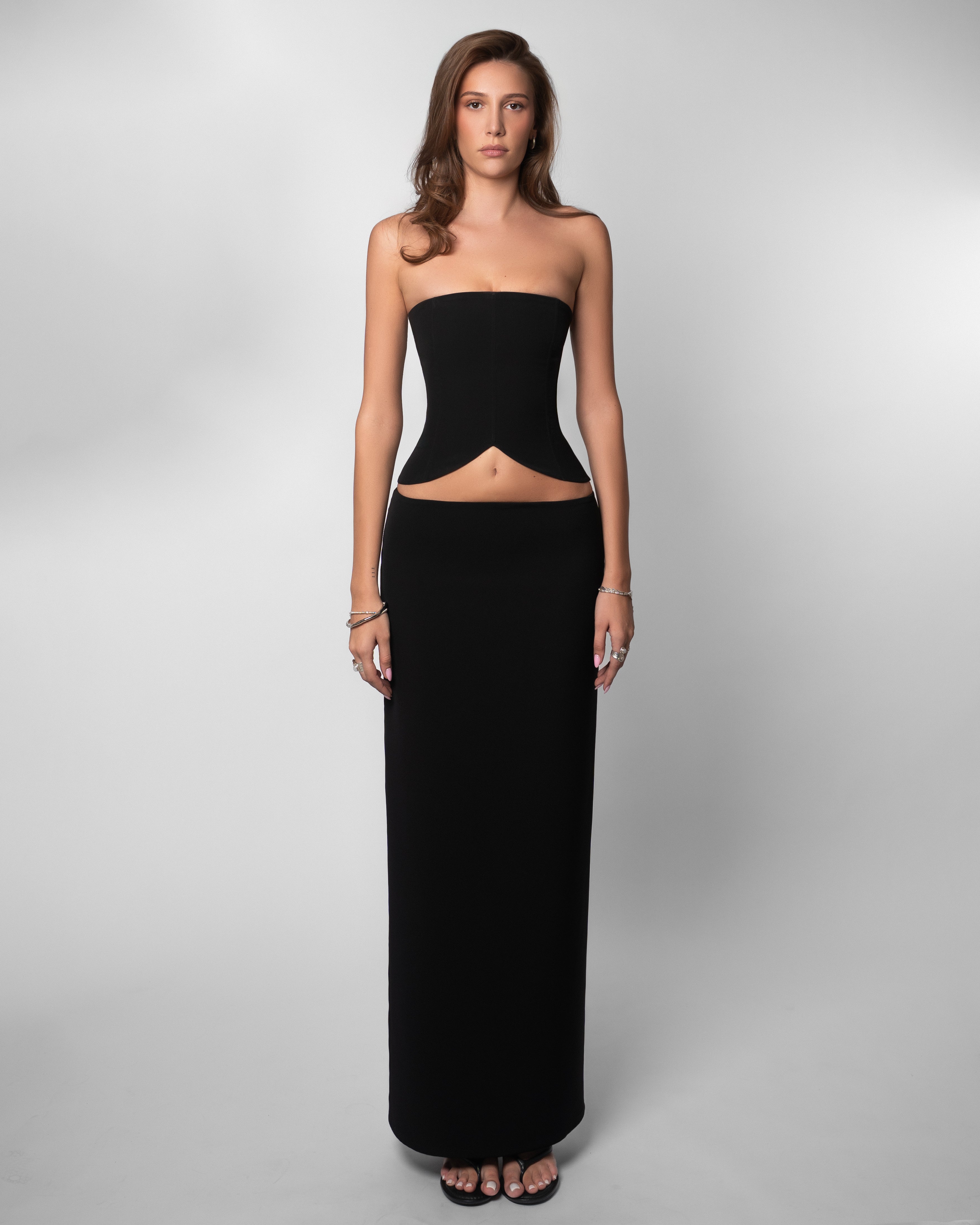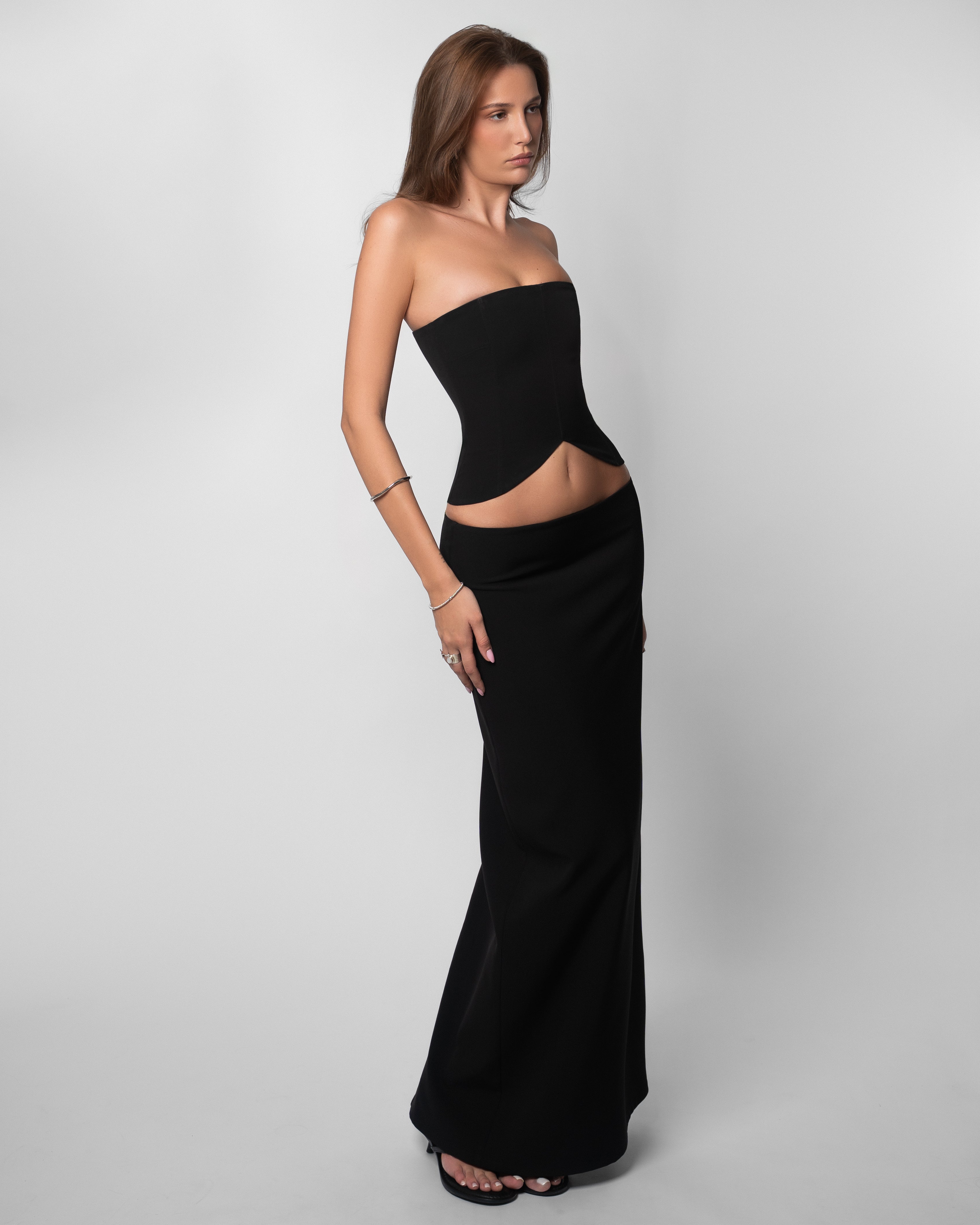 The Adele Set is minimalism with an edge. The black corset features structured boning and a sharp triangular cut at the bottom that reveals the waist and snatches the figure. Paired with a skirt, finished with a back slit for movement, both pieces close with sleek zippers.