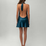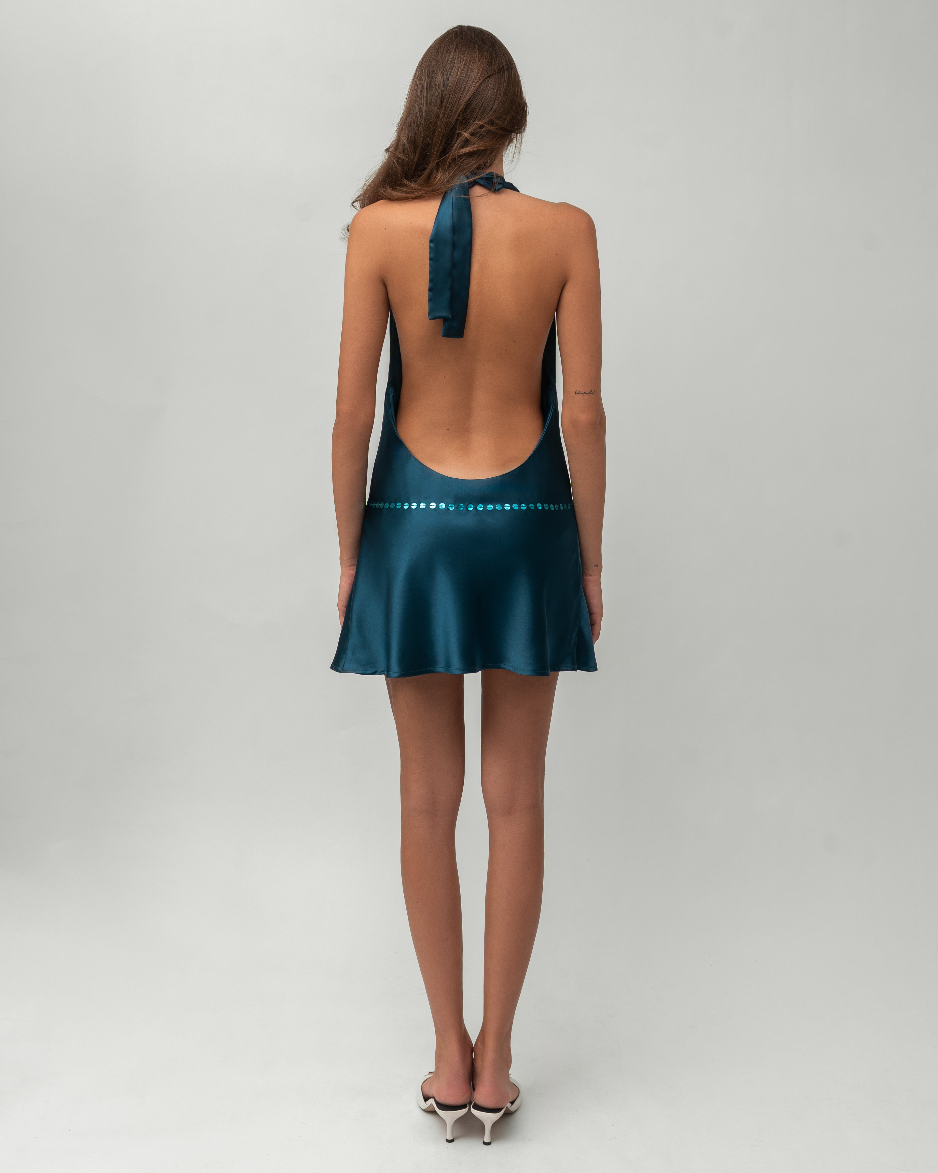 The Jade Dress is made for the night life. In deep navy, cut with a plunging cowl neckline, a full open back with a tie-up neck, and a line of sequins across the skirt that catches the light.