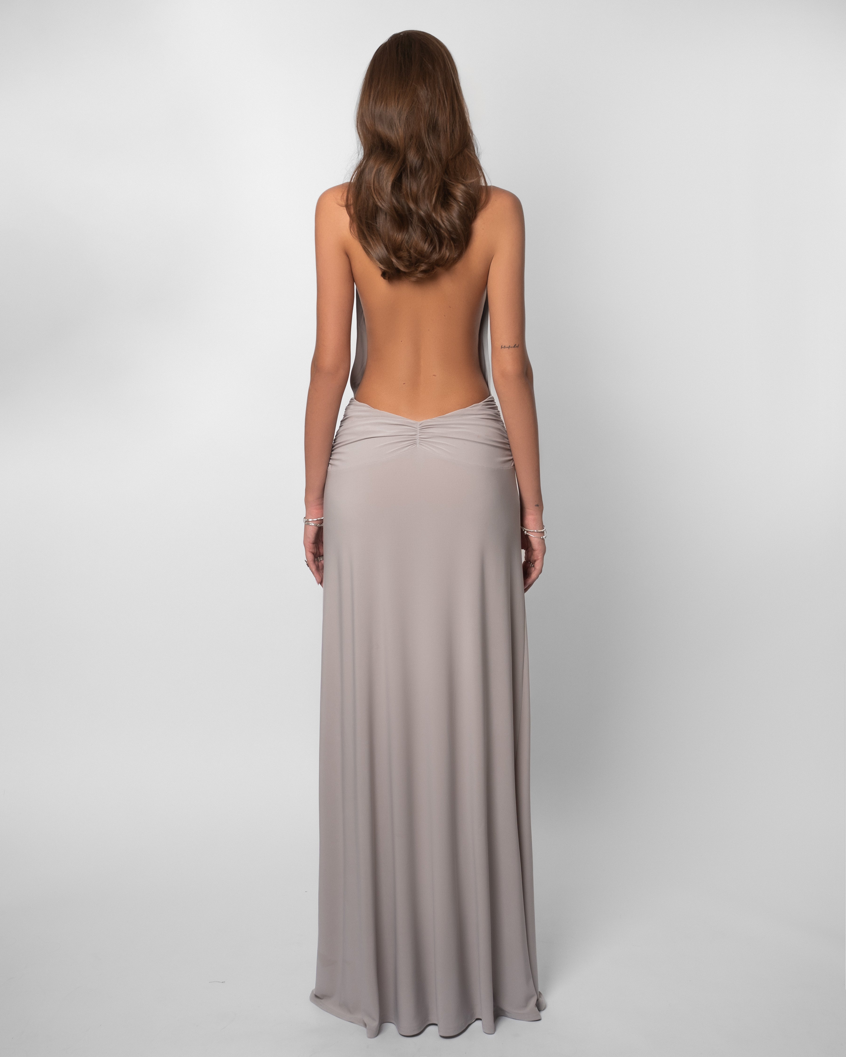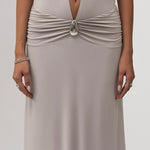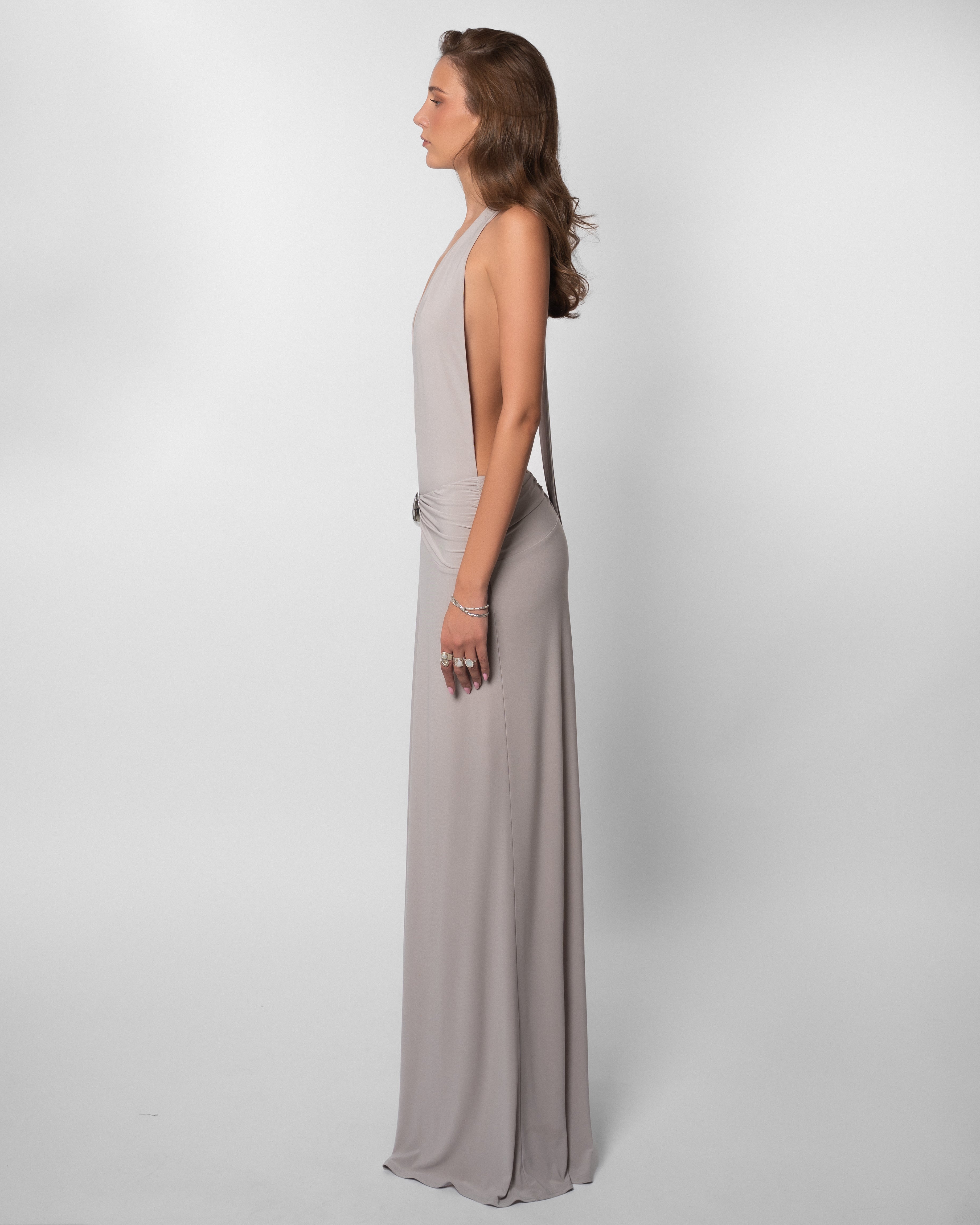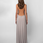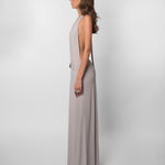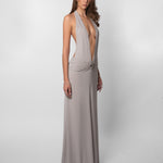 The Paloma Dress is our sexiest dress, yet its design feels subversive enough to be timeless. It has the softest gray fabric, a tie-neck, open back, and plunge that drops to the waist. Finished with a removable metallic brooch.