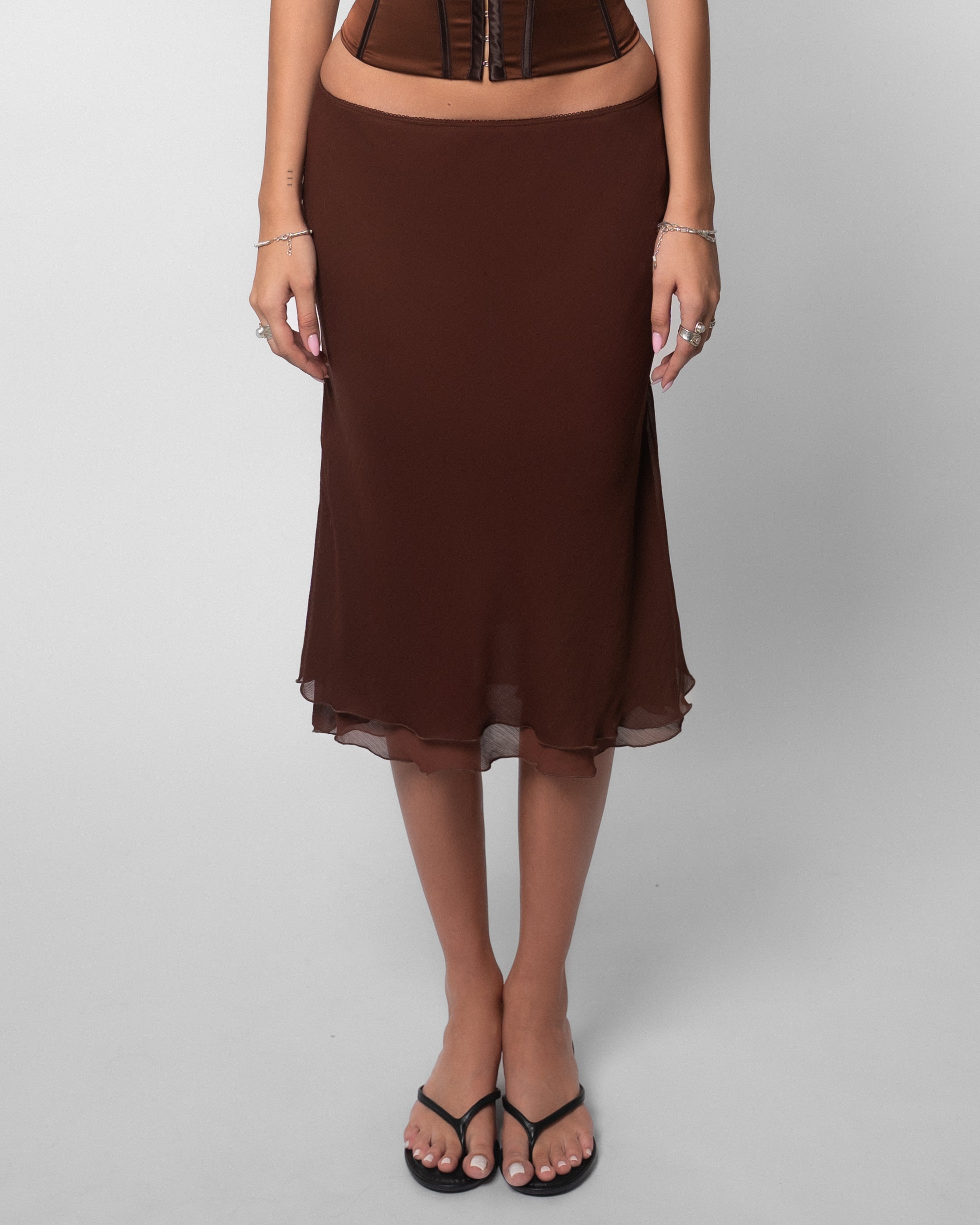 The Naomi Set stands apart in this fall collection as the only warm-toned piece. The brown corset, with hook-and-eye closures, boning and adjustable straps, it’s designed to snatch and lift. As a brand known for its midi skirts, we designed a matching two-layer, flowy, versatile skirt, made to complete the look.