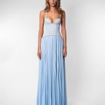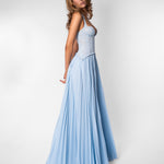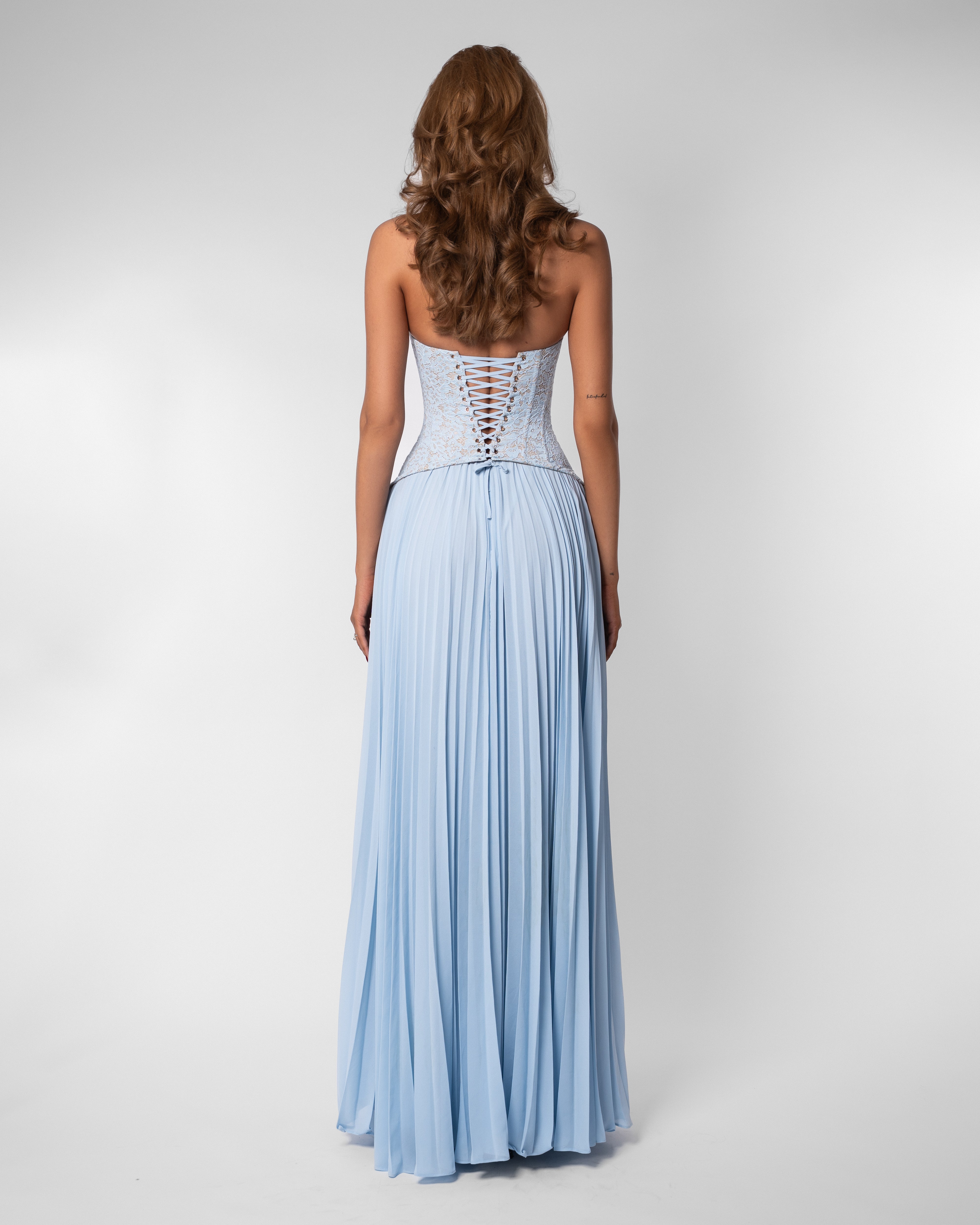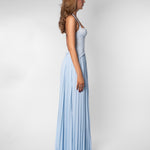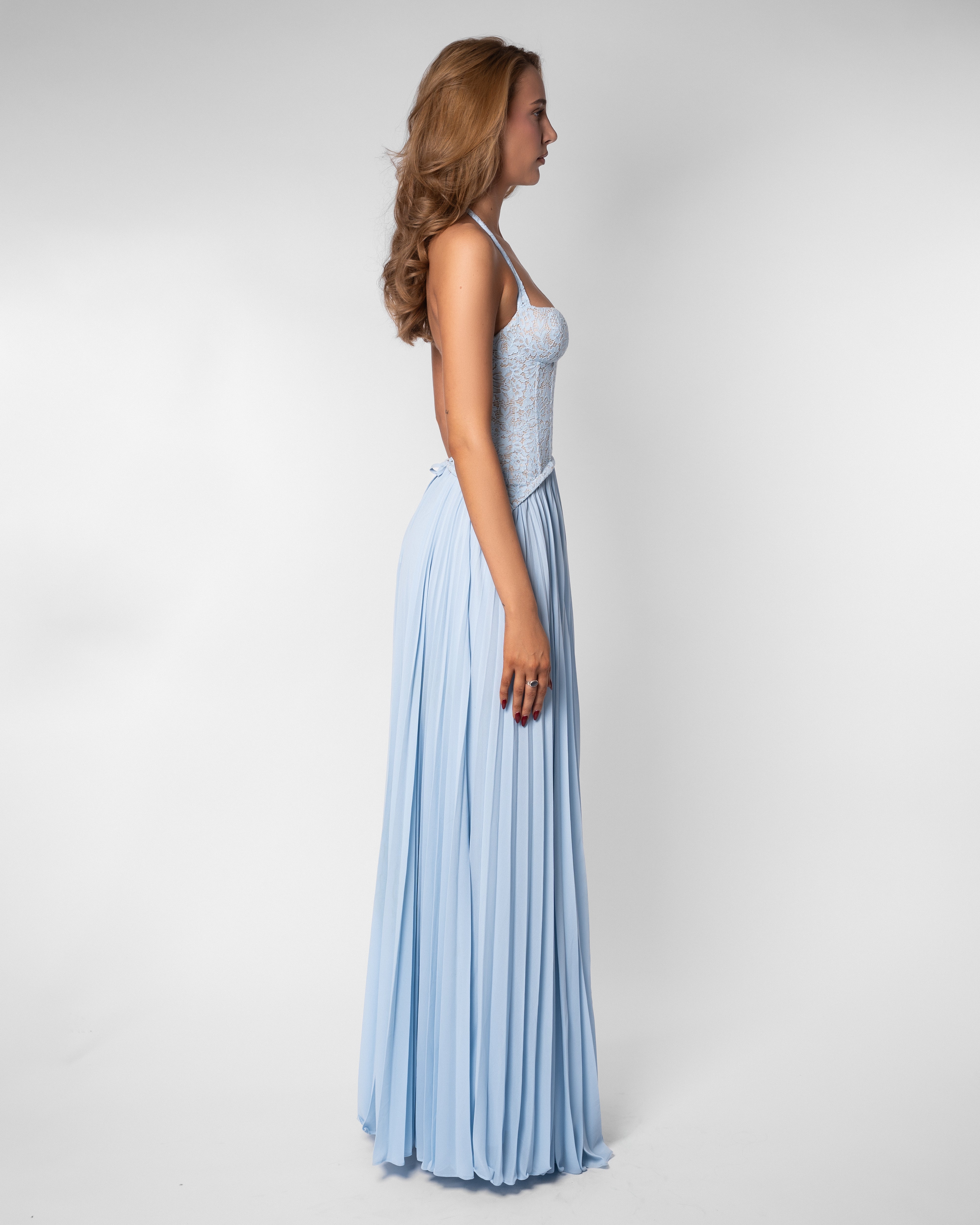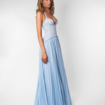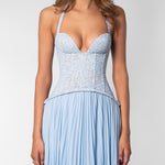 The Gaia Dress now comes in a soft blue, offering the same silhouette you love with a lighter, more delicate feel. Featuring our signature lace top with structured boning and a flowing pleated skirt, it's a piece that feels elegant & guaranteed to be the most unique dress in the room.