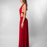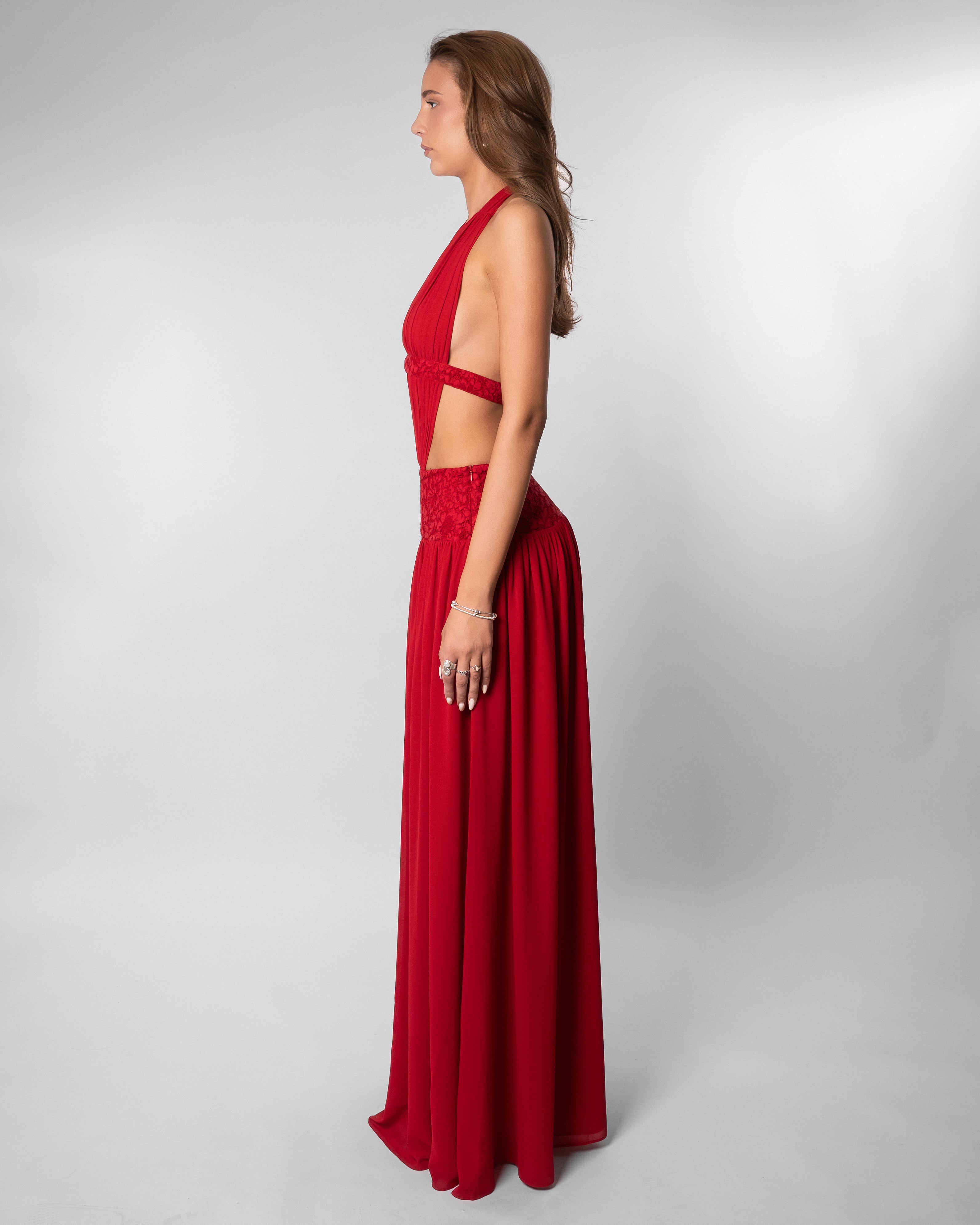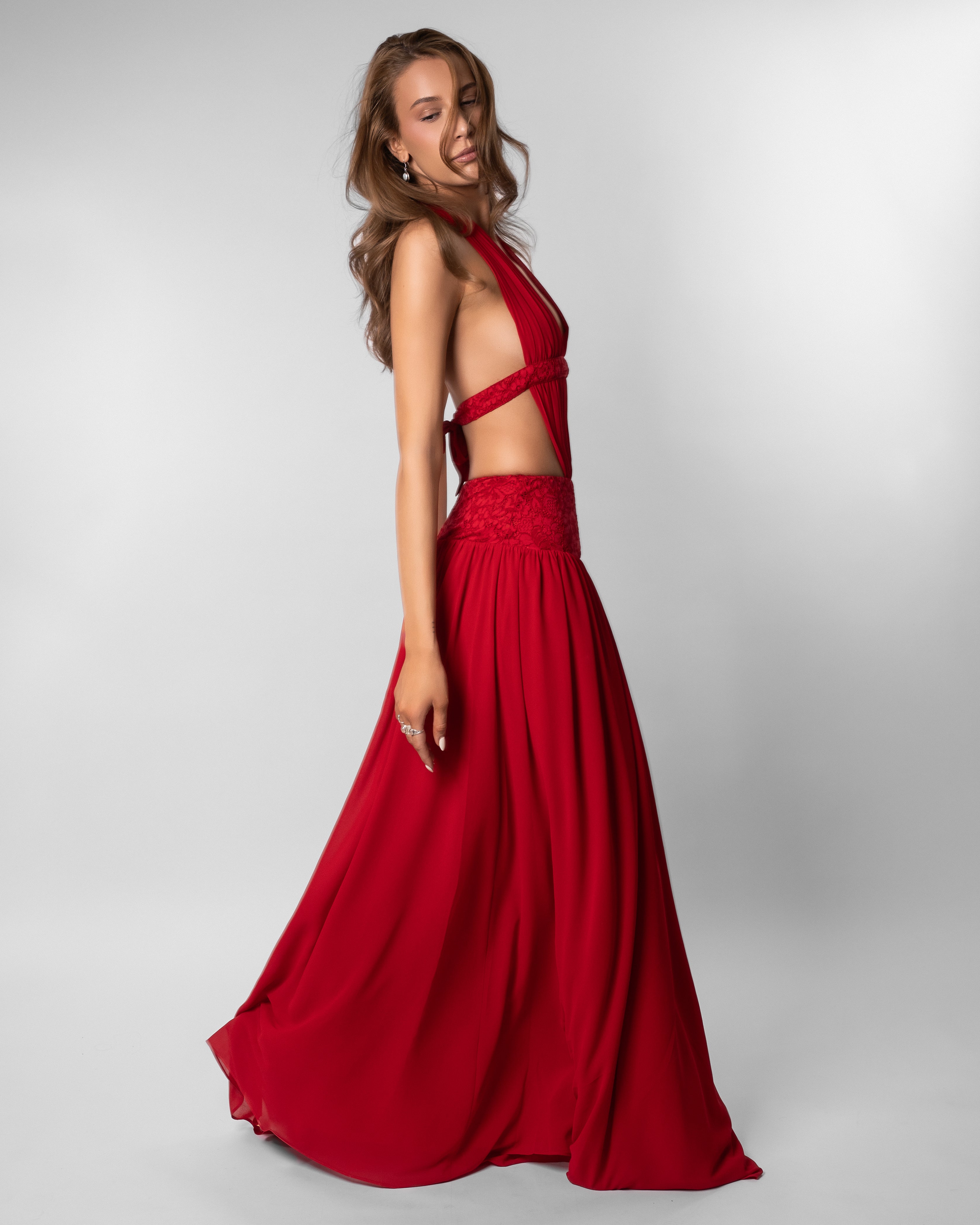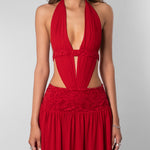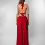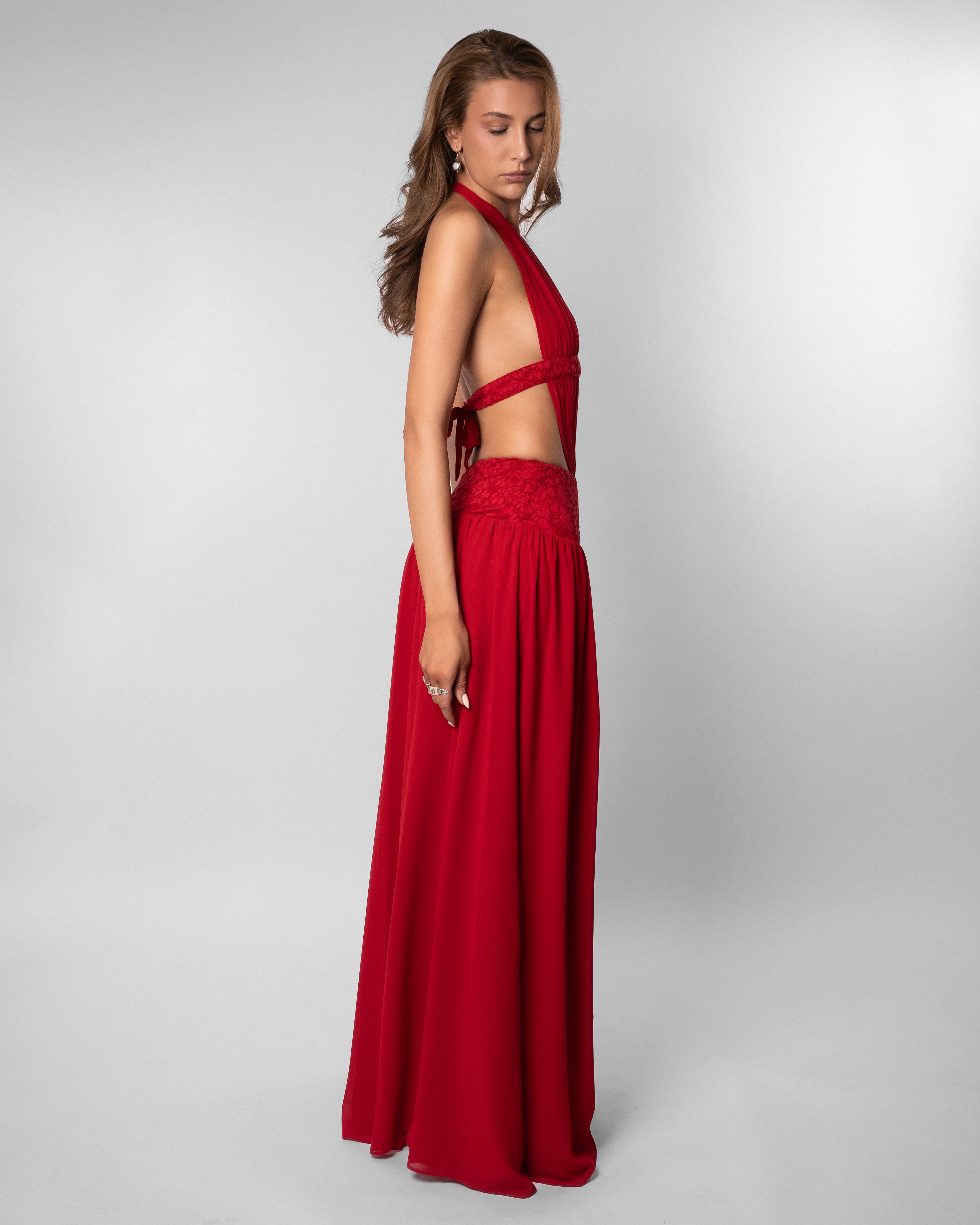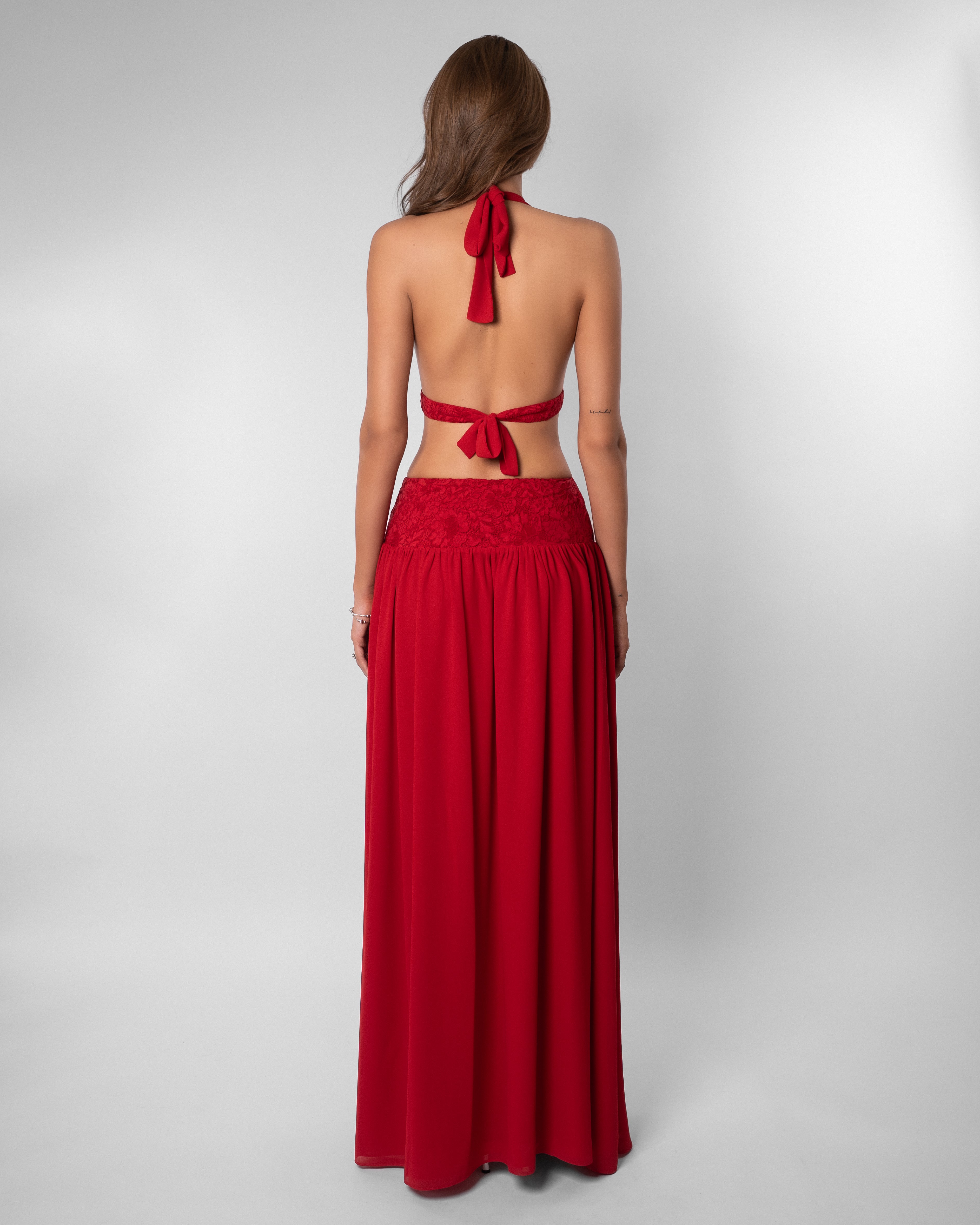 The Scarlett Dress comes in a bold red, featuring a halter neckline that ties at the neck and an adjustable underbust tie at the back for a flattering, supported fit. A structured lace waist detail creates a subtle drop-waist effect, finished with a flowing skirt that moves beautifully effortless and made to stand out.