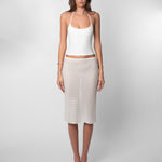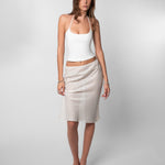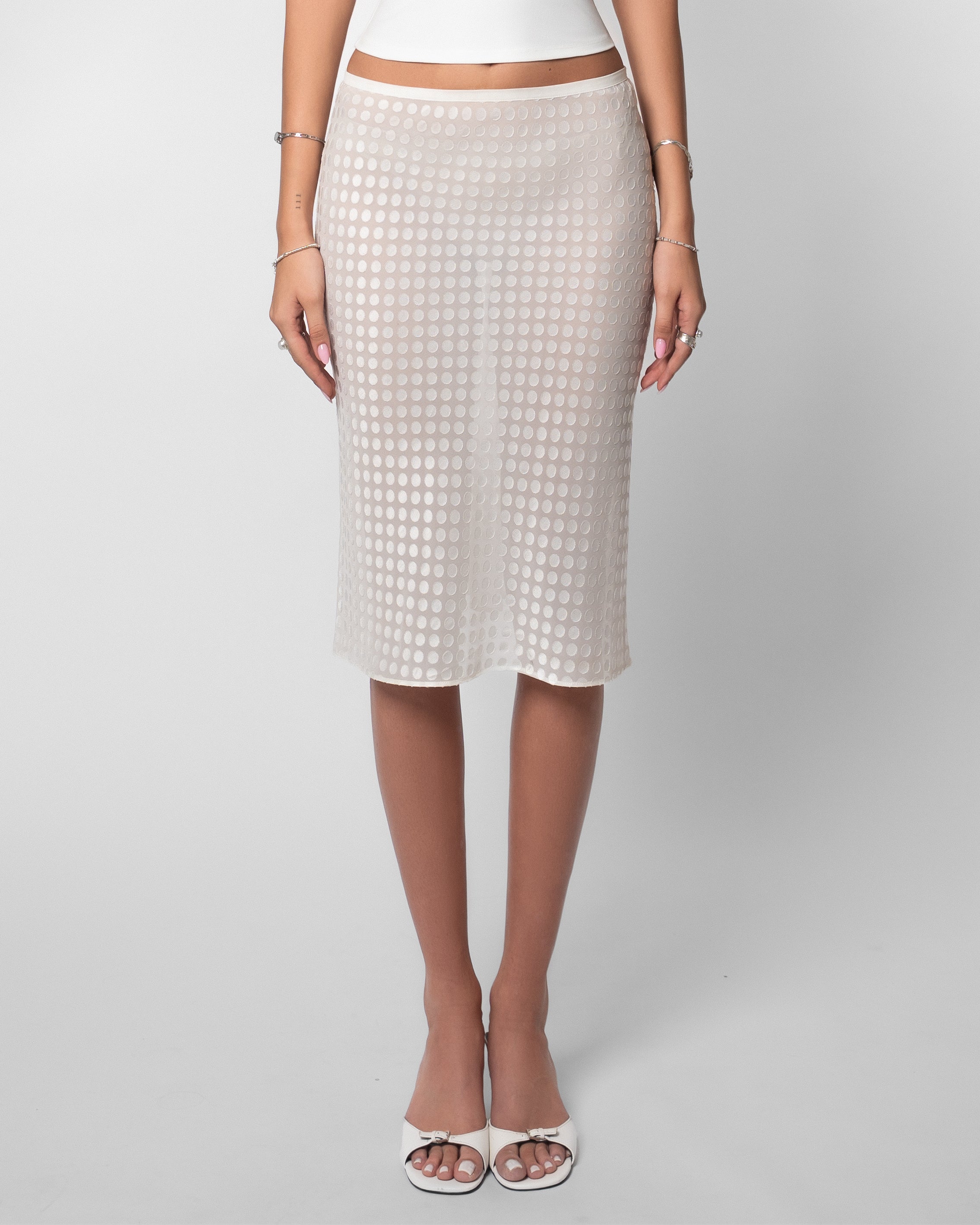 The Ariel Skirt is our take on polka dots through a 90s futuristic lense. Made from a unique semi-transparent chiffon with reflective satin dots, it’s light, fluid and made to move with you.