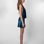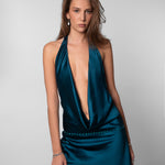 The Jade Dress is made for the night life. In deep navy, cut with a plunging cowl neckline, a full open back with a tie-up neck, and a line of sequins across the skirt that catches the light.